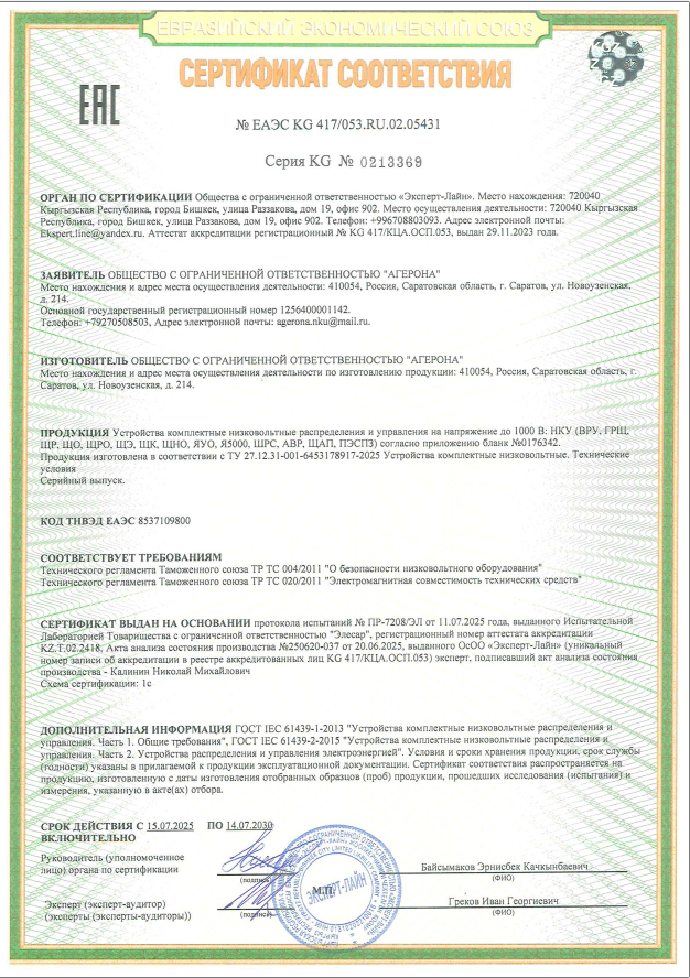 ООО «АГЕРОНА» — производственно‑техническая компания, специализирующаяся на разработке и изготовлении низковольтных комплектных устройств (НКУ) для промышленных, коммерческих и инфраструктурных объектов. Мы предлагаем полный цикл работ — от проектирования и подготовки прототипов до серийного производства, тестирования и сервисного сопровождения. Продукция отвечает действующим нормам и стандартам, проходит контроль качества на каждом этапе и адаптируется под технические задания заказчика.